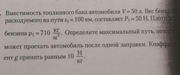 вместимость топливного бака автомобиля N=50л. вес бензина расходимость в пути S¹=100 км. составляет P¹=50м. плотность бензина p¹= 710кг/м³ определите максимальный путь который может проехать автомобиль после одной заправке коэффициент принять равным 10 Н/кг