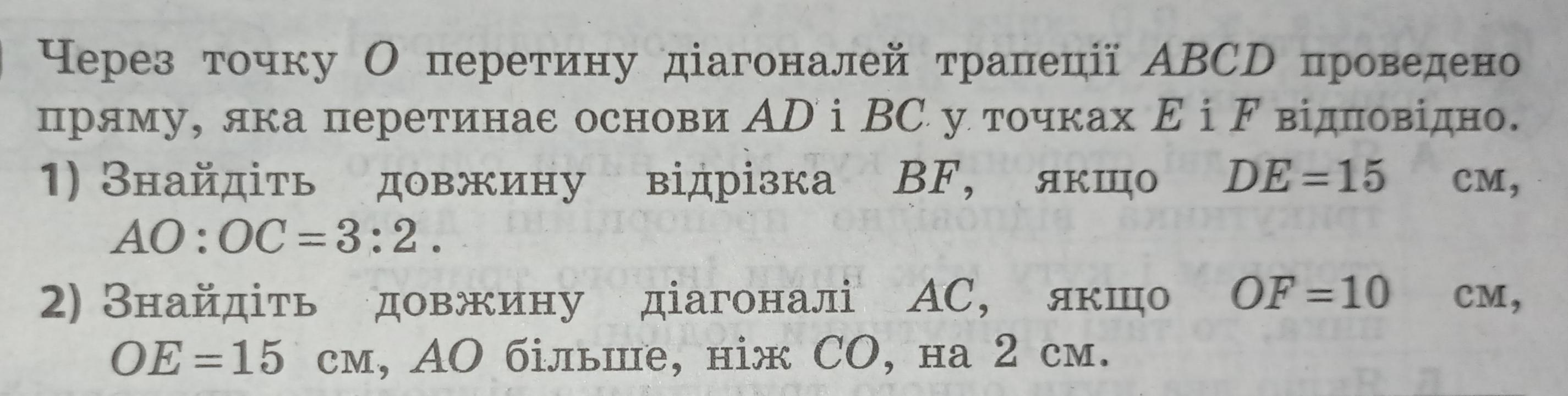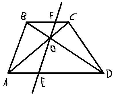 Рассмотрим △AOE и △COF. У них <OAE=<OCF как накрест лежащие при параллельных BC и AD и секущей АС. <AOE=<COF как вертикальные. Значит △AOE ~ △COF по 2м углам. Значит можно записать соотношение сторон: