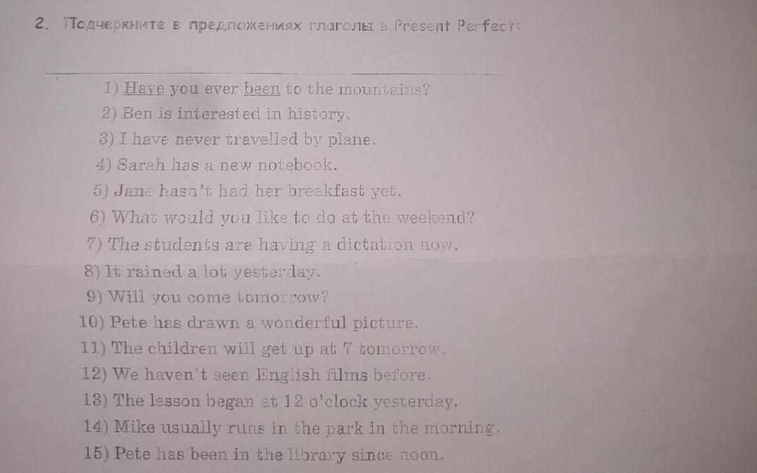 вы уверены, что нужно было подчеркнуть только в тех предложениях, где Present Perfect? Я просто подумала, что нужно в каждом подчеркнуть такой глагол, который мог бы употребляться в такой же форме в Present Perfect...ну в задании, по крайней мере, не сказано, что подчеркивать надл только предложения в Present Perfect