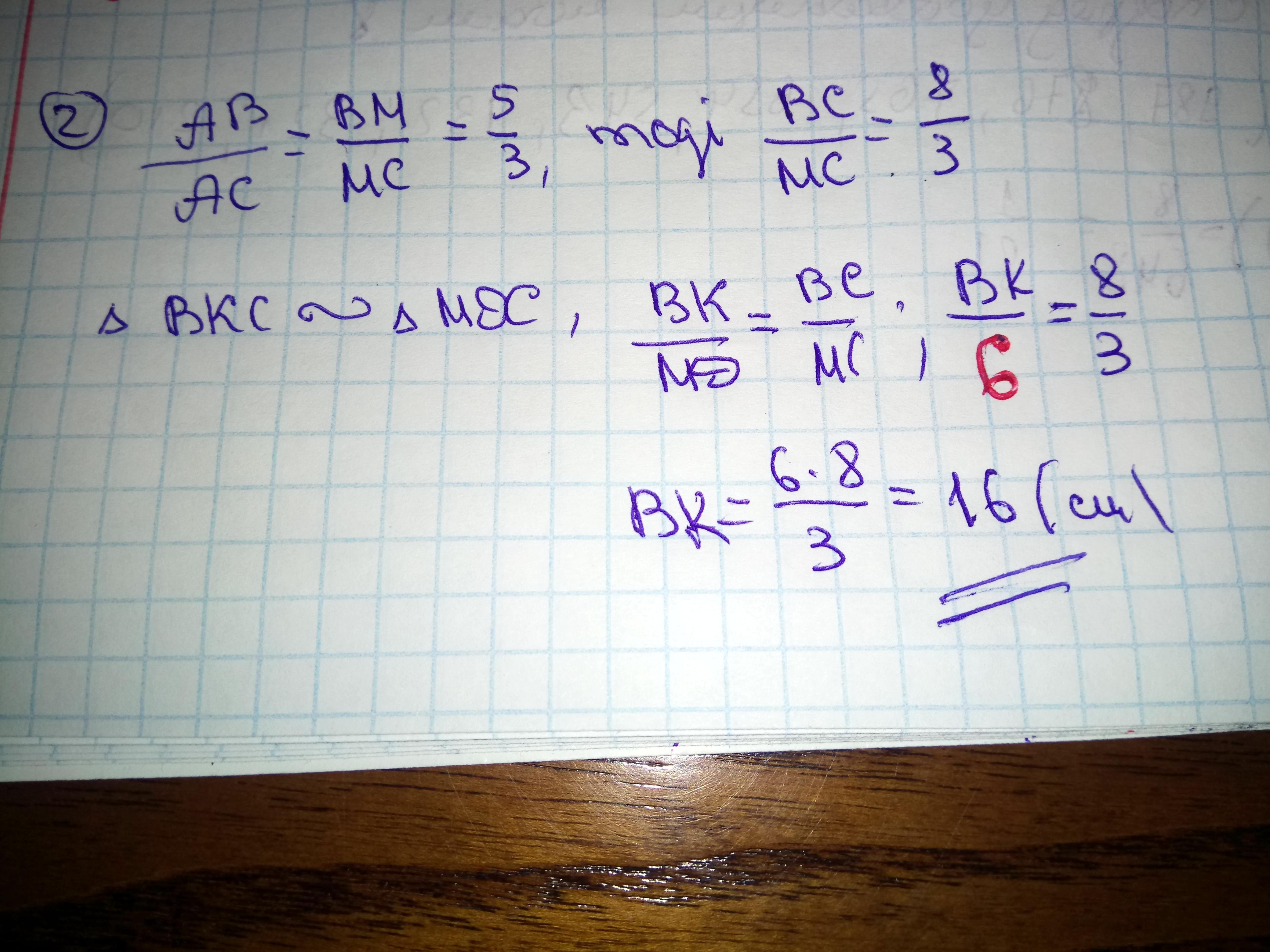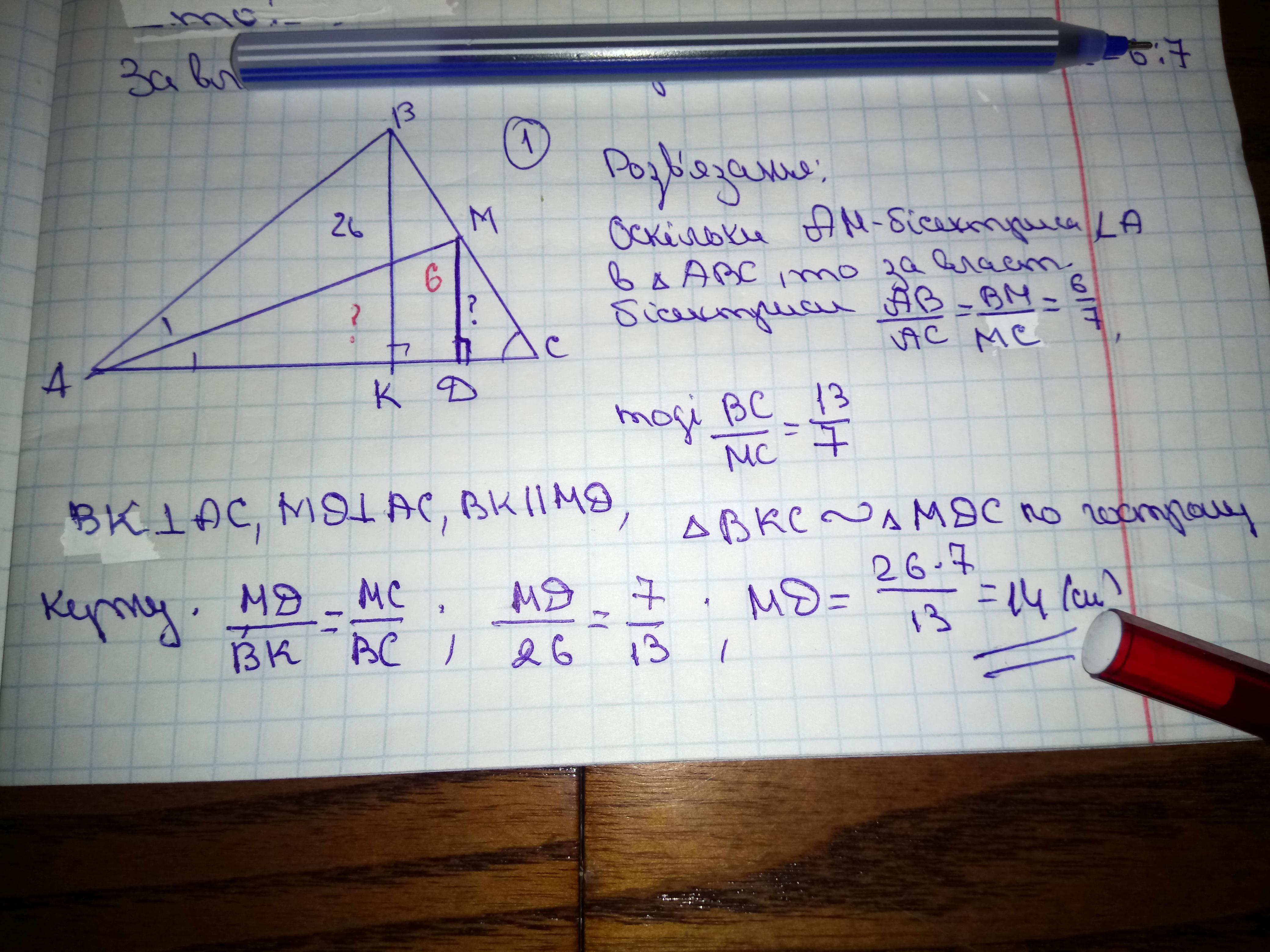 В треугольнике АВС отрезок ВК является высотой, отрезок АМ - би сектрисою; с точки М проведены перпендикуляр МD к сто- роны АС. 1) Найдите MD, если ВК = 26 см, АВ: АС = 6: 7. 2) Найдите ВК, если АВ: AС = 5: 3, MD = 6 см.