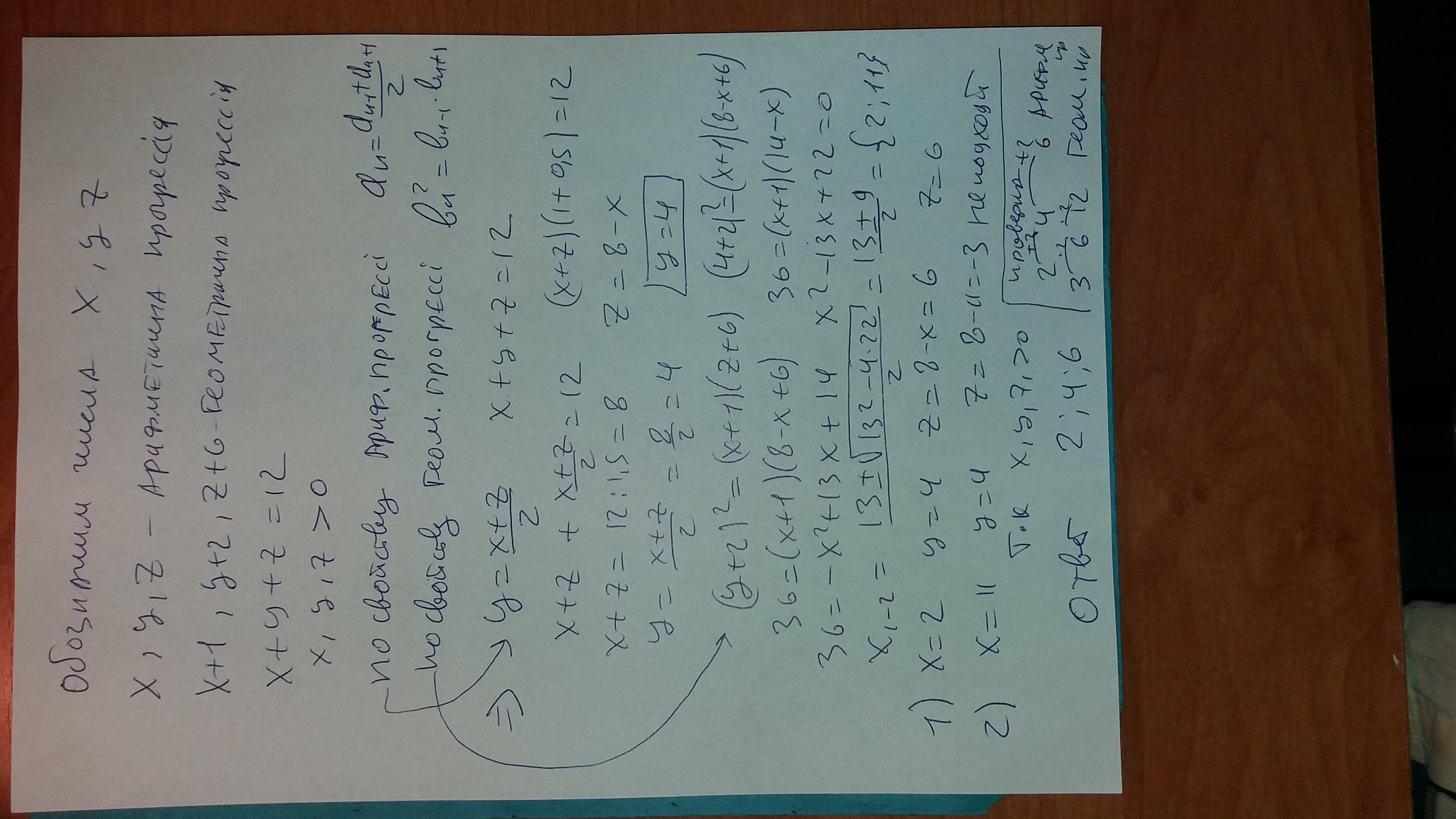Три додатних числа дають в сумі 12 i складають арифметичну прогресію. Якщо до них відповідно додати 1;2;6, то одержані числа складуть геометричну прогресію. Знайти ці числа.