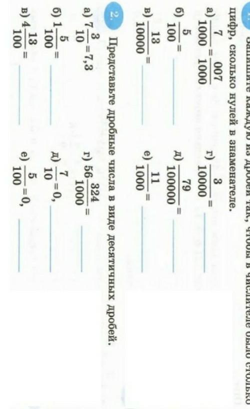 в 1 задании написано: запишите каждую дробей так, что бы в числителе было столько цифр сколько нулей в знаменателе