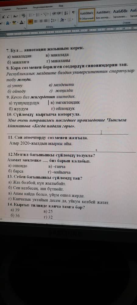 10) Мага Чынгыз Ацтматовдун акыркы Тоолор кулаганда-чыгармасы жакты.