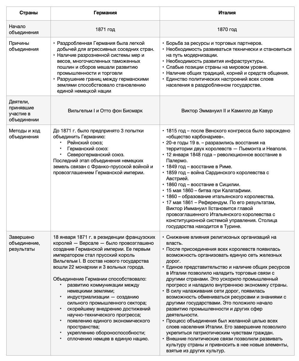 Заполните сравнительную таблицу об объединении Германии и Италии:
