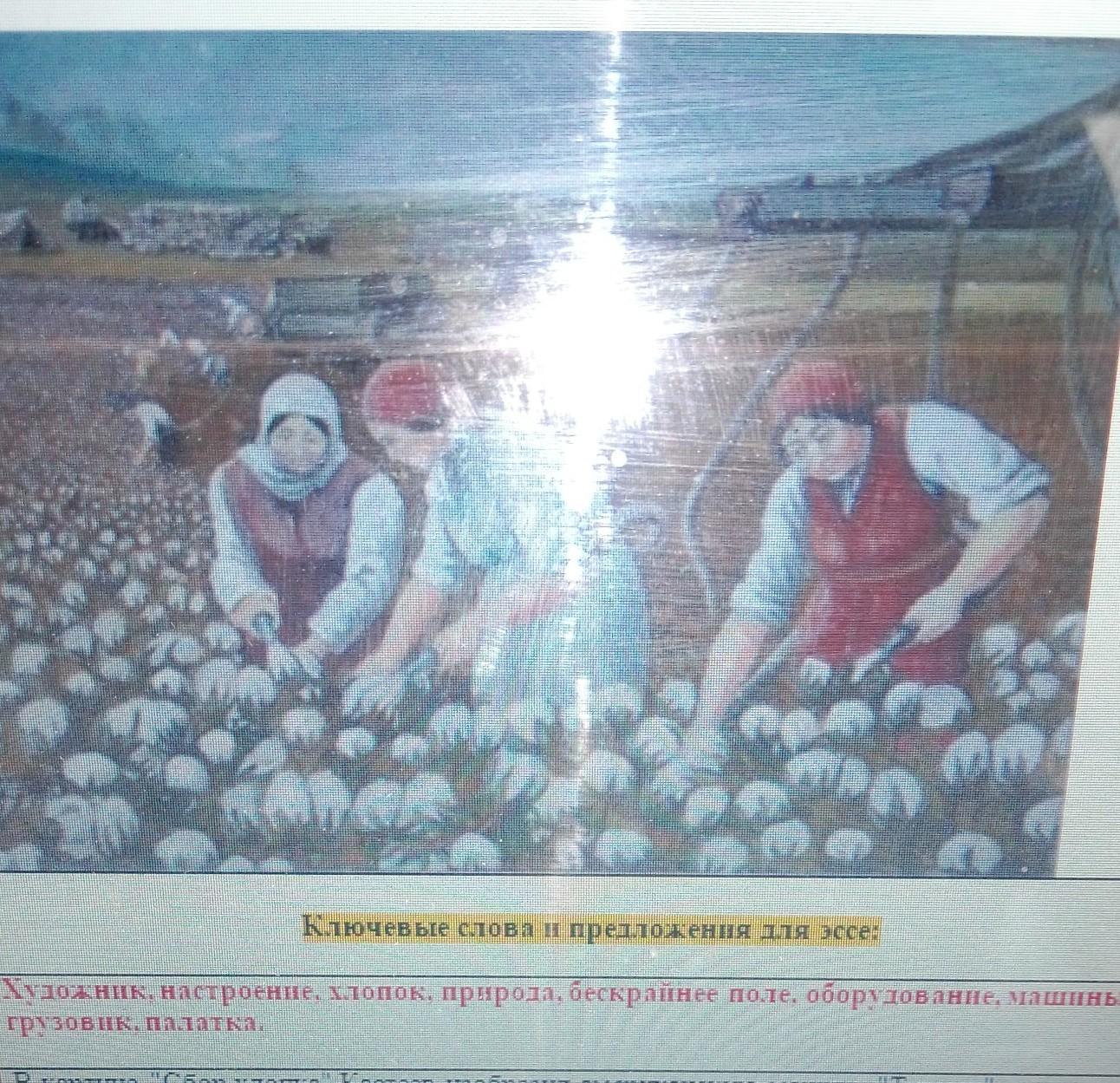 На картине художник изобразил поле хлопчатника и женщин, собирающих богатый урожай хлопка. Мы видим бескрайний простор, который на горизонте сливается с небом.