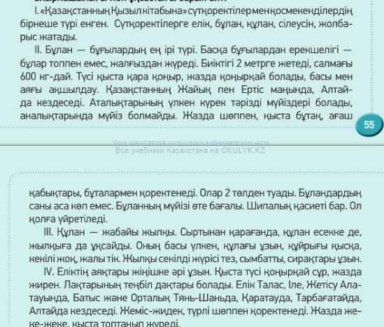 2)Сүтқоректілерге не жатады? Елік, бұлан, құлан, сілеусін, жолбарыс.
