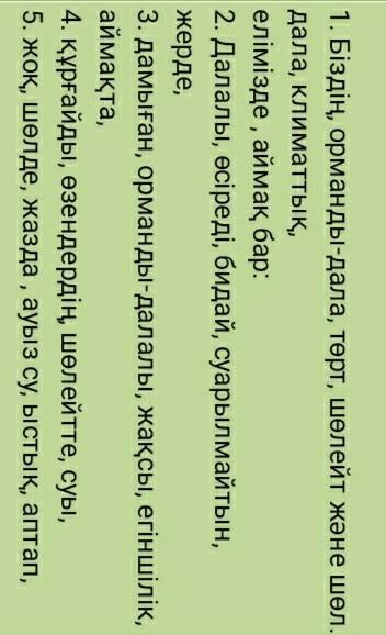 1. Біздің елімізде төрт климаттық аймақ бар: орманды-дала, дала, шөлейт және шөл.