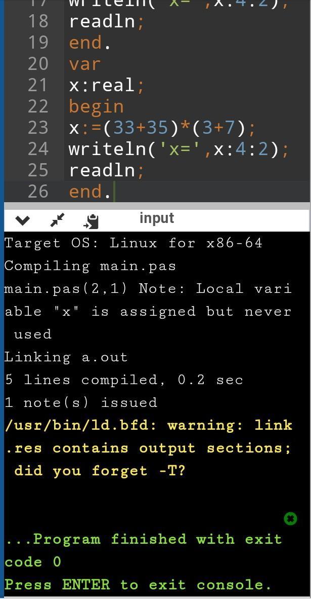 Запиши программу для вычисления x в Паскале и выведи на экран.