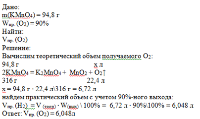 какой объем кислорода может быть получен в результате разложения 94,8 г перманганата калия KMnO4,если выход реакции составит 90% от теоретически возможного