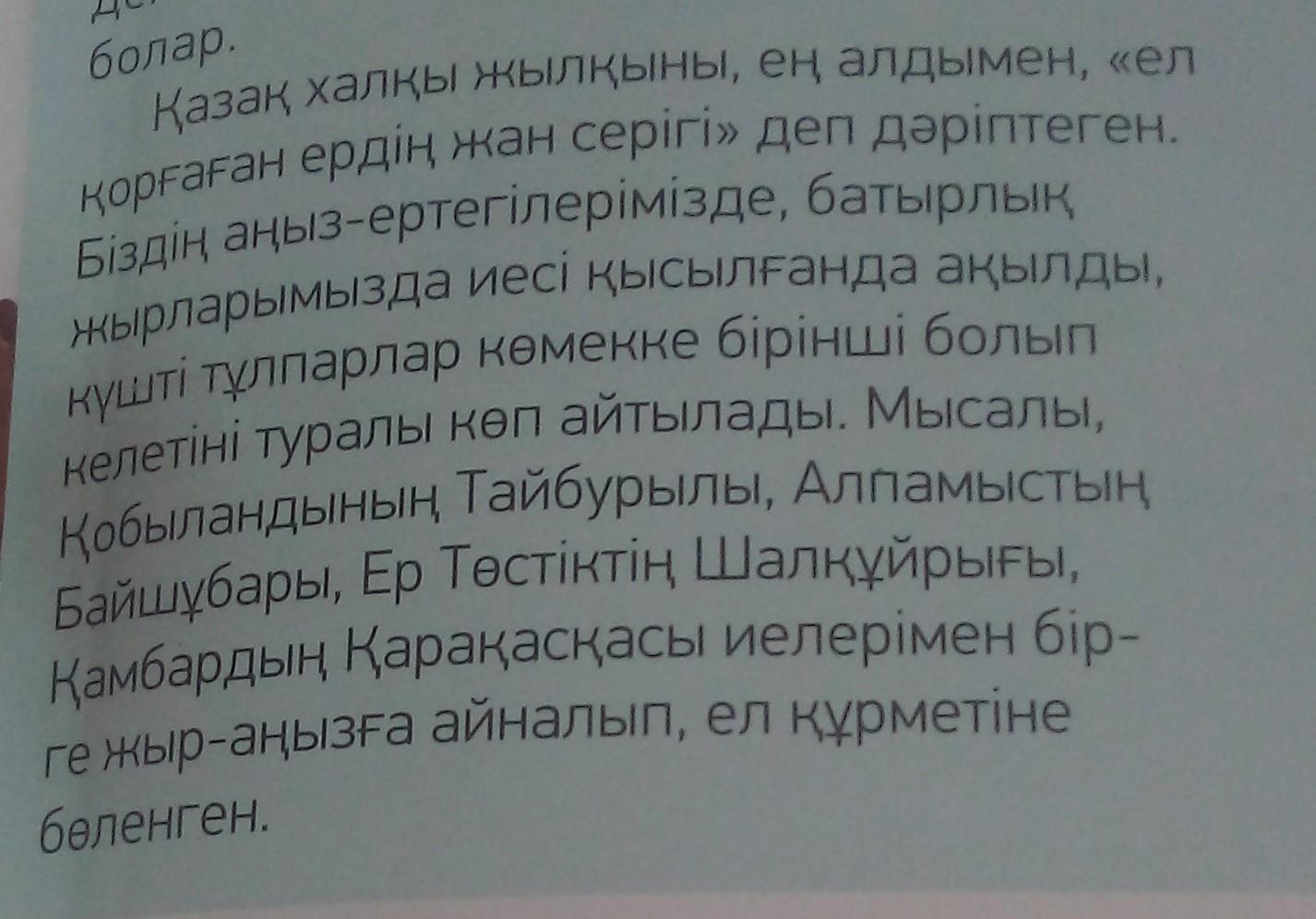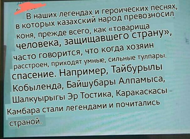Наша легенда гласит, что в наших сказках и героических песнях, когда хозяин угнетен, умные и сильные тулпары первыми помогают казахскому народу, в первую очередь лошади. Например, Тайбурылы Кобыленда, Байшубары Алпамыса, Шалкуйрыгы Эр Тостика, Каракаскасы Камбара стали легендой и почитались страной.