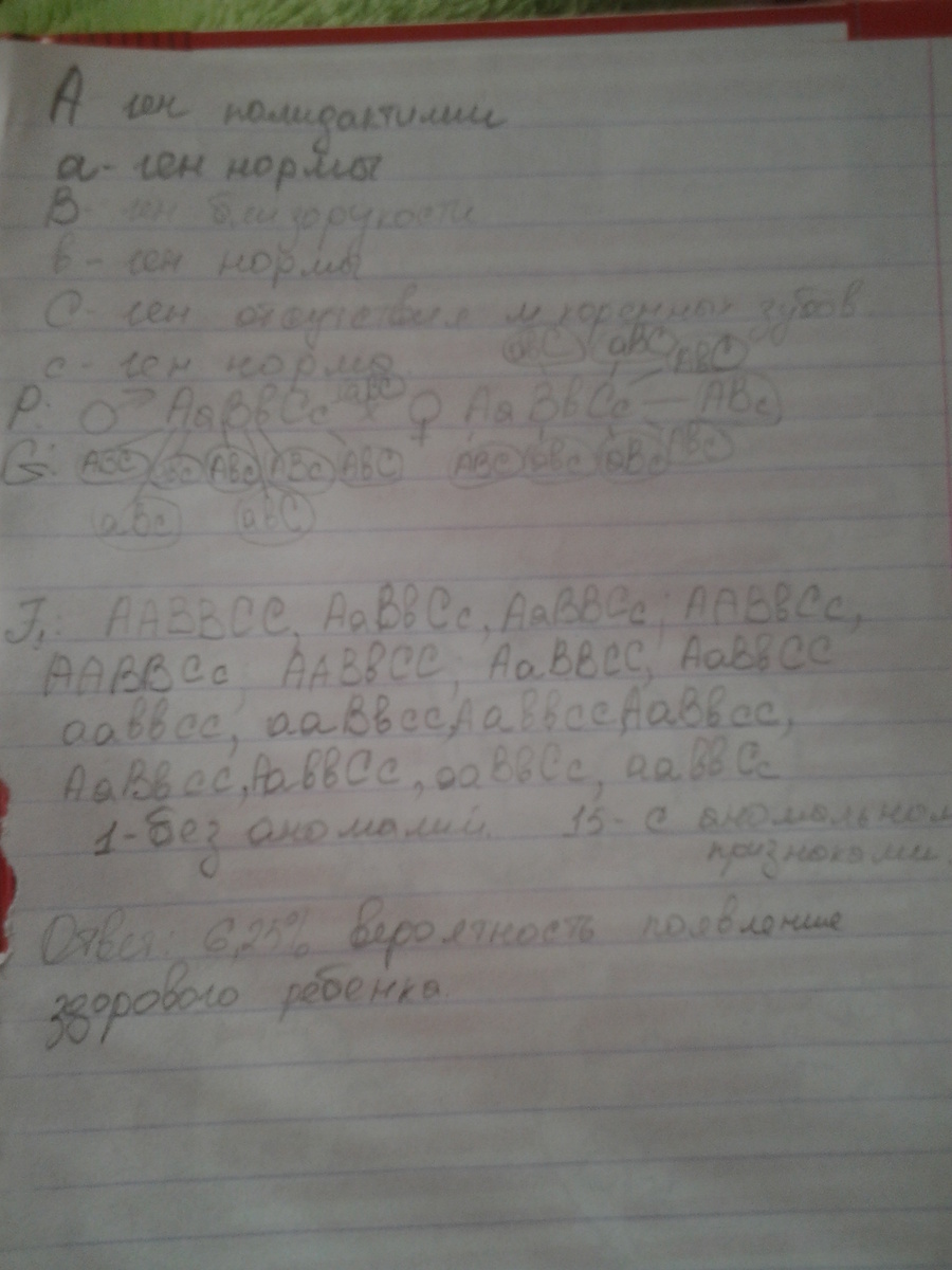 1. У человека полидактилия, близорукость и отсутствие малых коренных зубов передаются как доминантные признаки. Определите вероятность рождения детей без аномалий в семье, где оба родителя страдают всеми тремя недостатками, но гетерозиготны по всем трем парам генов?