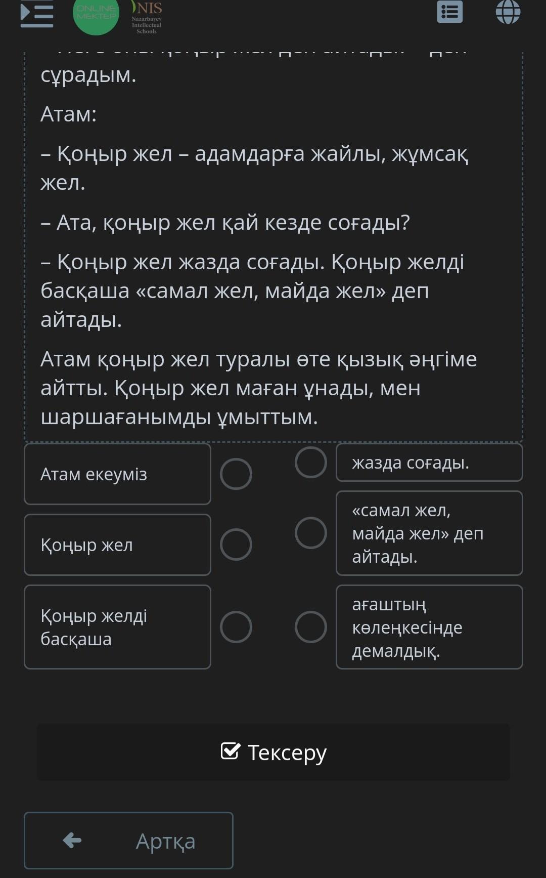 Жазда атаммен жайлауға бардым. Күн ыстық болды, жолда шаршадық. Атам екеуміз ағаштың көлеңкесінде демалдық. Бір мезетте жел соқты. Жел шөптермен, ағаштың жапырақтарымен ойнады.