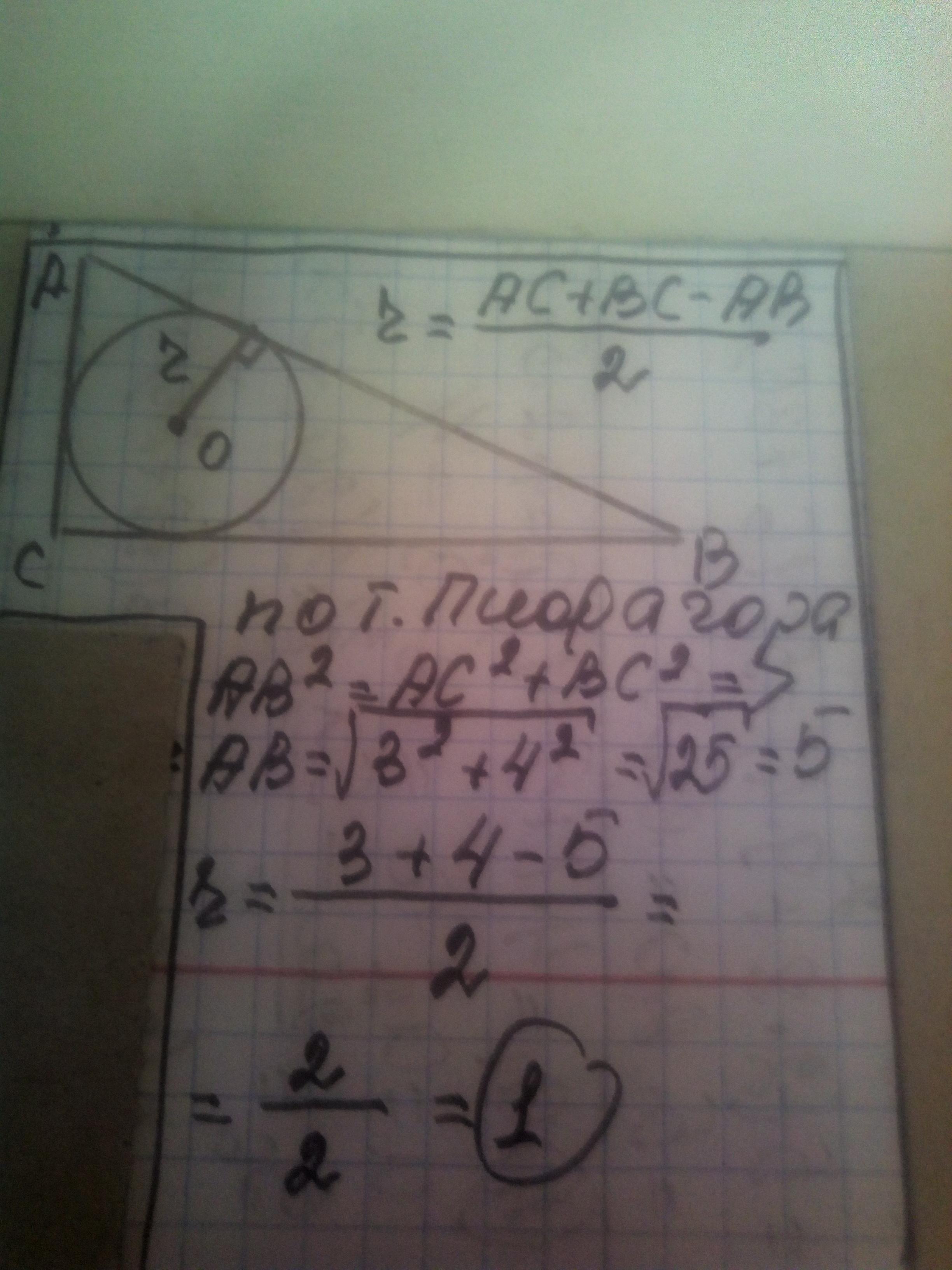 катеты прямоугольного треугольника 4 см и 3см. найдите радиус окружности, вписанной в треугольник