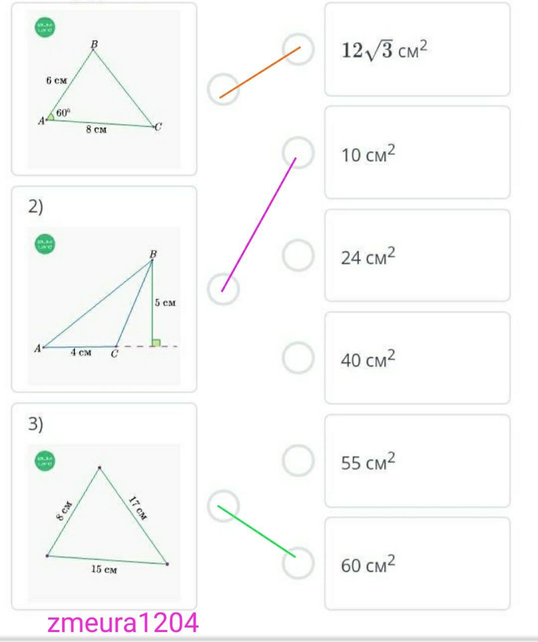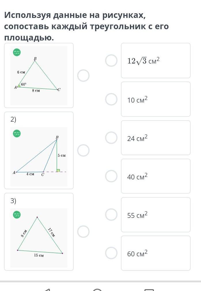 Используя данные на рисунках, сопоставь каждый треугольник с его площадью.