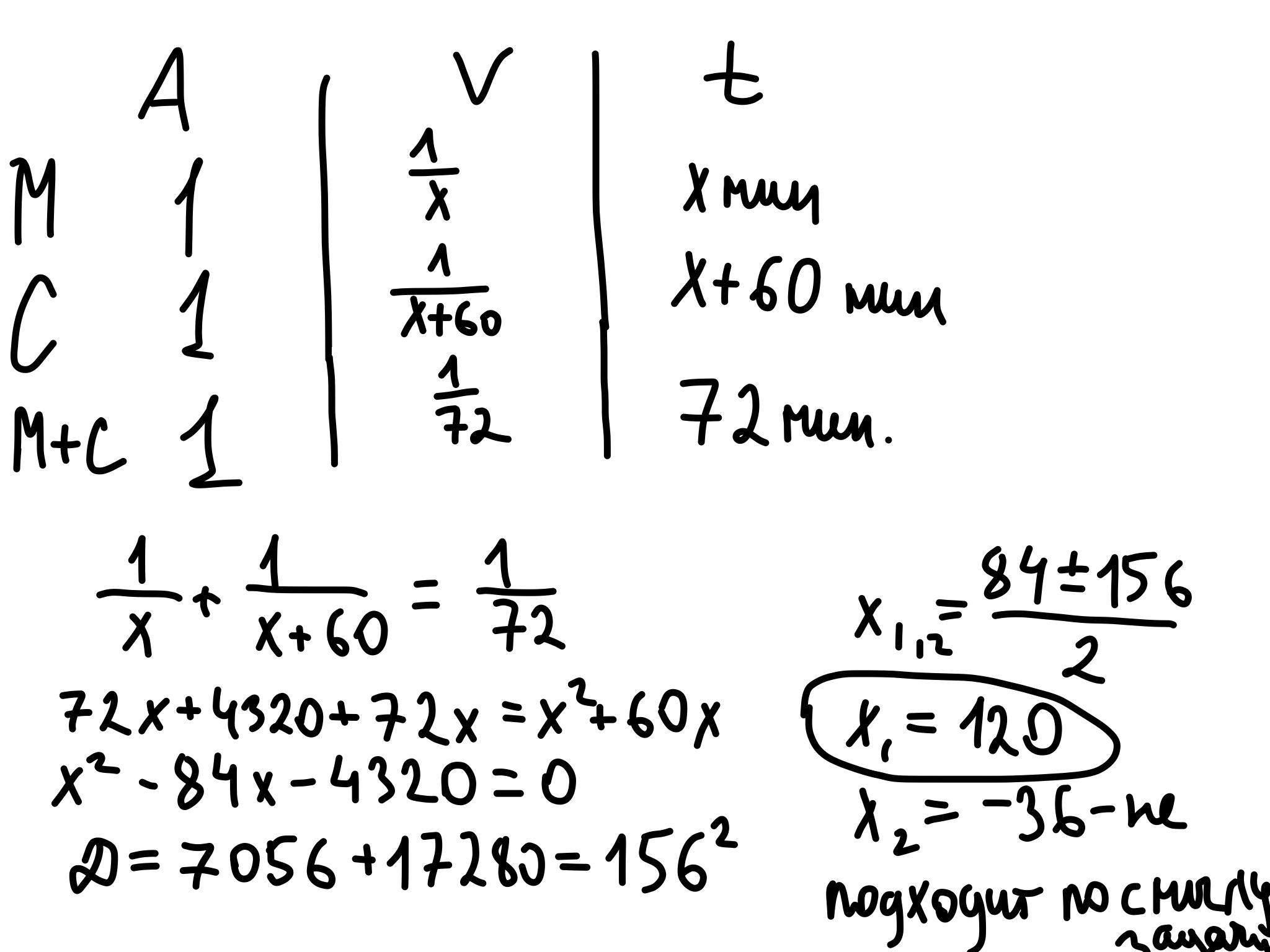 Марина Георгиевна и Сергей Александрович, принимая вместе зачет по геометрии в 8 классе, могут справиться с этой работой за 1 час 12 минут. Марина Георгиевна, принимая зачет одна затратит на это на час меньше,чем один Сергей Александрович. За какое время примет зачет одна Марина Георгиевна?