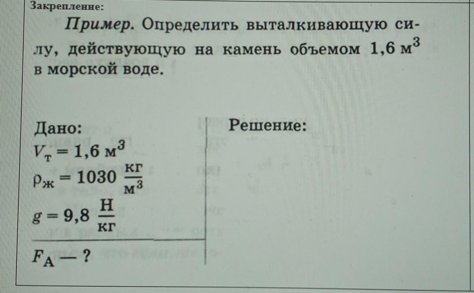 Fa=pж×g×Vт=1030×9,8×1,6=16480Па