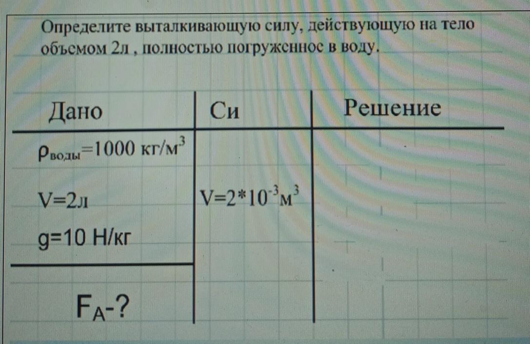 Fa=pж×g×Vт=1000(кг/м^3)×10(н/кг)×2×10^-3 (м^3)=20Н