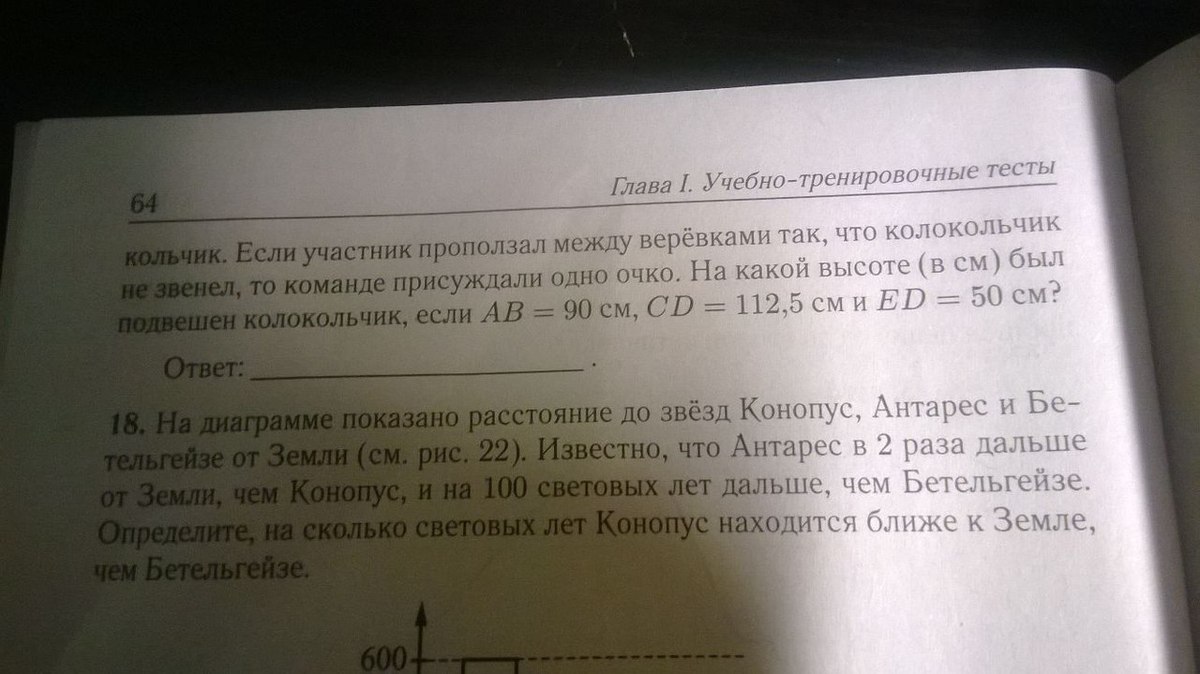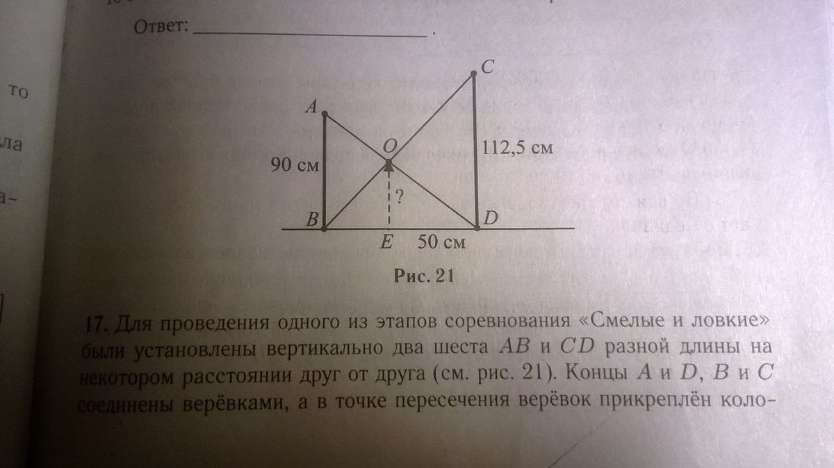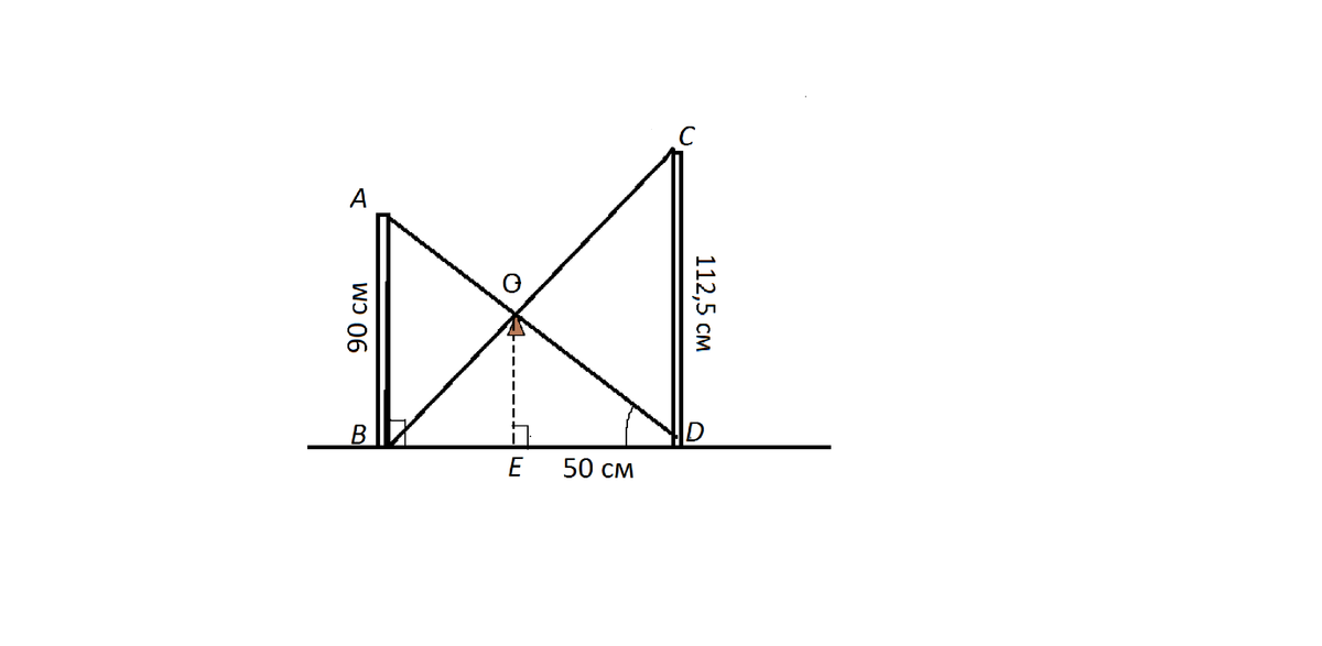 Для проведения одного из этапов соревнования "Смелые и ловкие" были установлены вертикально два шеста АВ и СDразной длины на некотором расстоянии друг от друга. Концы А и D, В и С соединены веревками, а в точке пересечения веревок прикреплен колокольчик. Если участник проползал между верёвками так, что колокольчик не звенел, то команде присуждали одно очко. На какой высоте ( в см) был подвешен колокольчик, если АВ=90 см, СD=112,5 см и ЕD=50 см?