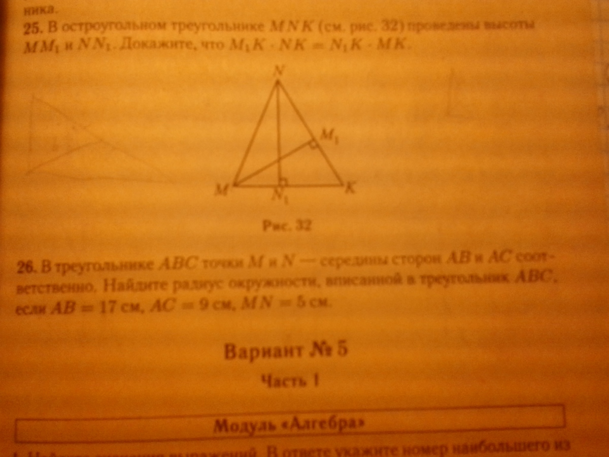 В треугольнике АВС точки М и N СЕРЕДИНЫ сторон АВ и АС соответственно. Найдите радиус окружности, вписанной в треугольник АВС , если АВравно17см , АСравно9см МNравно 5 см