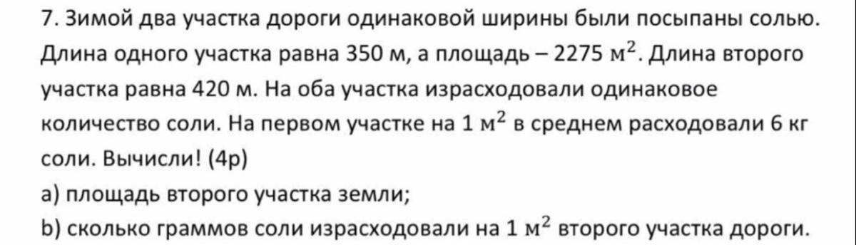 2) Ширина участка дороги равна S=ab. b= S/a=2275 / 350 = 6,5 метра.