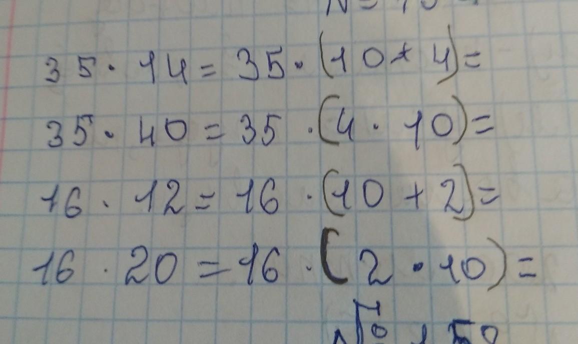 напряги извилины, и перемножай скобки почленно. покажу на одном далее самостоятельно. 35*( 10+4)= 35*10+35*4=350+140 ; далее 35*4 * 35*10 = 140 * 350= 16(10+2)=16*10+16*2=,,,,,,,, 16*2 * 16*10=32*160=....... калькулятор тебе в помощь, или старым дедовским способом (проверенный временем) -столбиком. удачи!!!