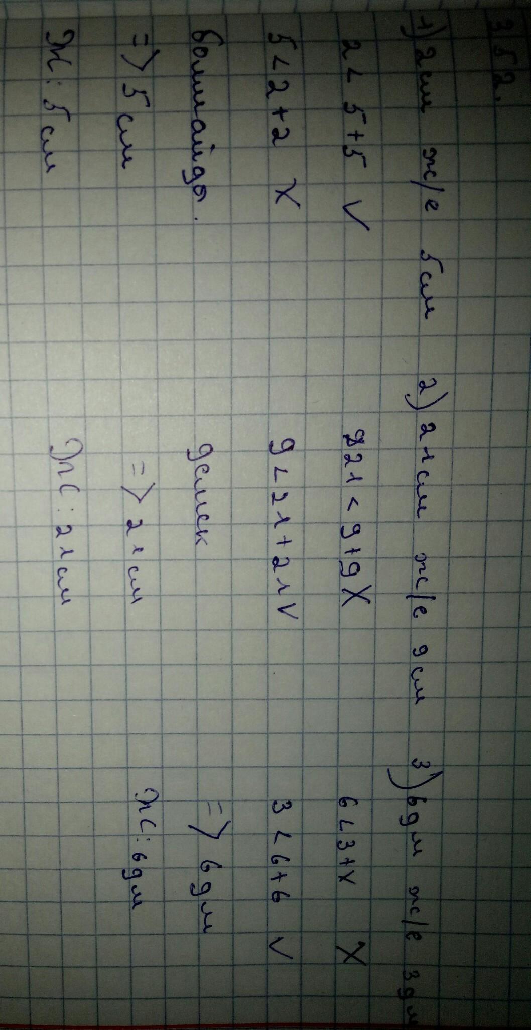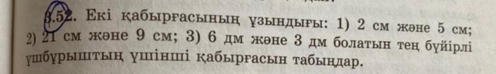 3.52. Екі қабырғасының үзындығы: 1)2см және 5см; 2)21см және 9см; 3)6дм және 3дм болатын те бүйірлі үшбұрыштың табаны брлуы мүмкін?