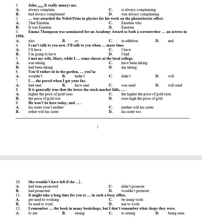 Заполните пробелы в предложениях одним из четырех вариантов, приведенных ниже. На вопросы 1–12 выберите правильный ответ A, B, C или D.