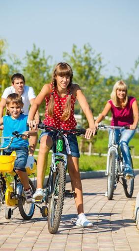 This family spending their time in the park. They are riding a bikes. Mother wearing a shirt and jeans. Father wearing white T-shirt. Little brother wearing blue T-shirt and shorts and girl wearing shorts too. I loved this picture, it looks very cute. This picture is beautiful