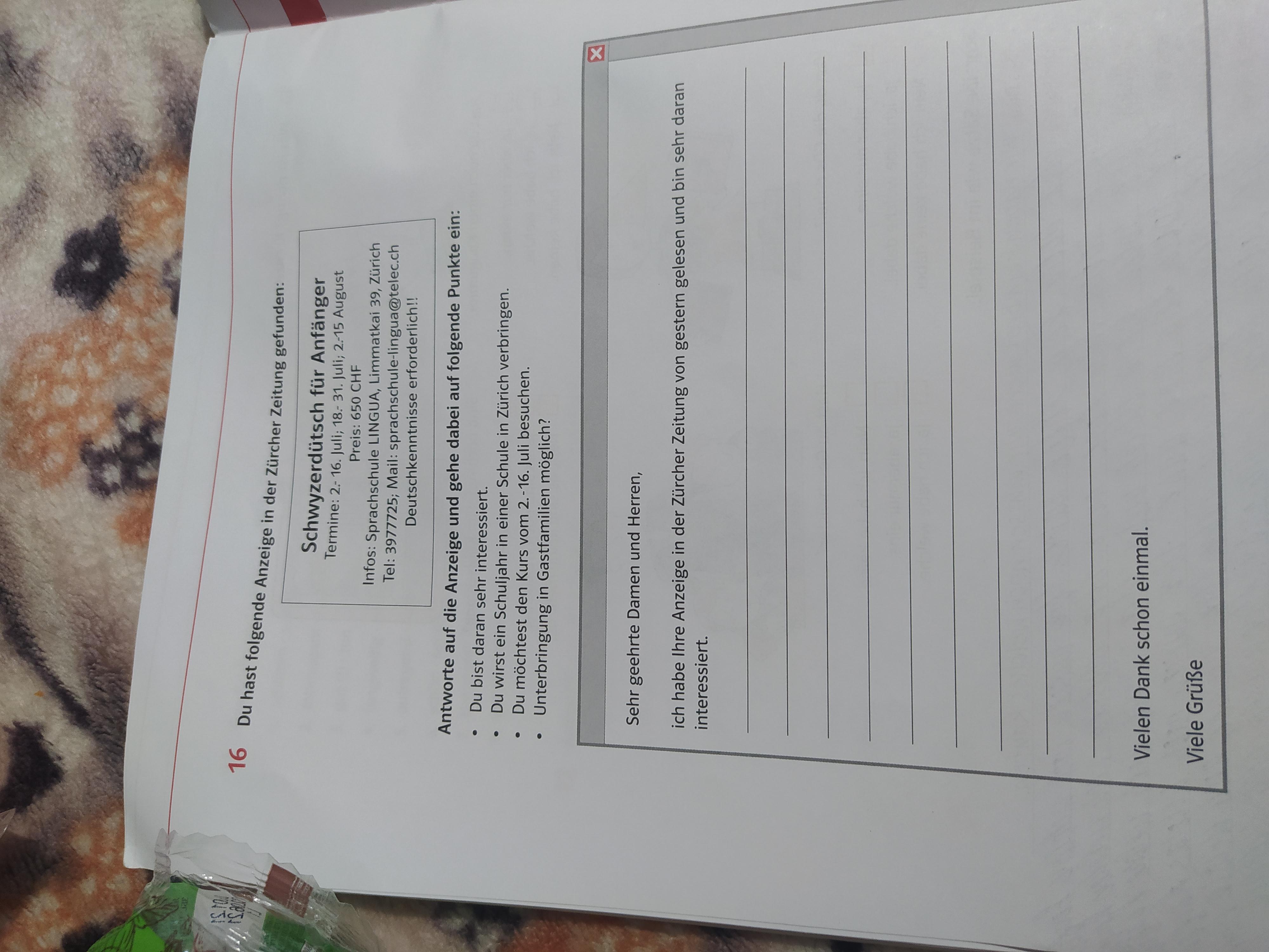 Mein nächstes Schuljahr werde ich in einer Schule in Zürich verbringen. Der Unterricht beginnt im Septemer. Ich plane aber im Juli nach Zürich zu kommen, um mich gut in der neuen Stadt einzuleben. Ich würde den von Ihnen angebotenen Kurs sehr gerne vom 2.- 16. Juli besuchen und möchte diesen Termin buchen. Teilen Sie mir bitte mit, ob eine Unterbringung in Gastfamilien möglich wäre. Das wäre für mich auch eine gute Möglichkeit, meine Sprachkenntnisse zu verbessern.