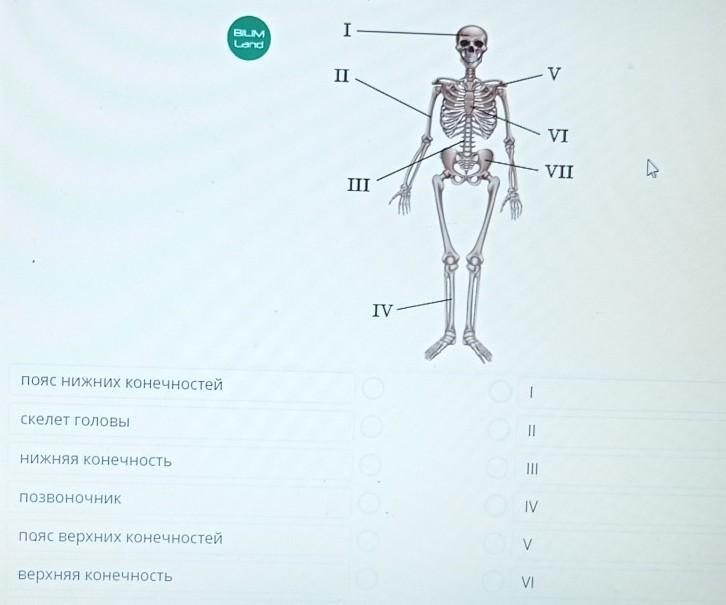 позвоночник 3, скелет головы 1, пояс н конечностей 5, нижняя конечность 4, верхняя конечность 2, а пояс верхних конечностей 7