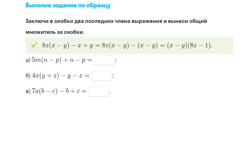 Ответ: a) (n-p)(5m+1); б) (y+z)(4x-1); в) (b-c)(7a-1).