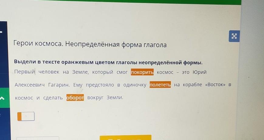 Выдели в тексте оранжевым цветом глаголы неопределённой формы первый человек на земле который смог покорить Космос Это Юрий Алексеевич Гагарин ему предстояло в одиночку болеть на корабле Восток и сделать оборот вокруг Земли