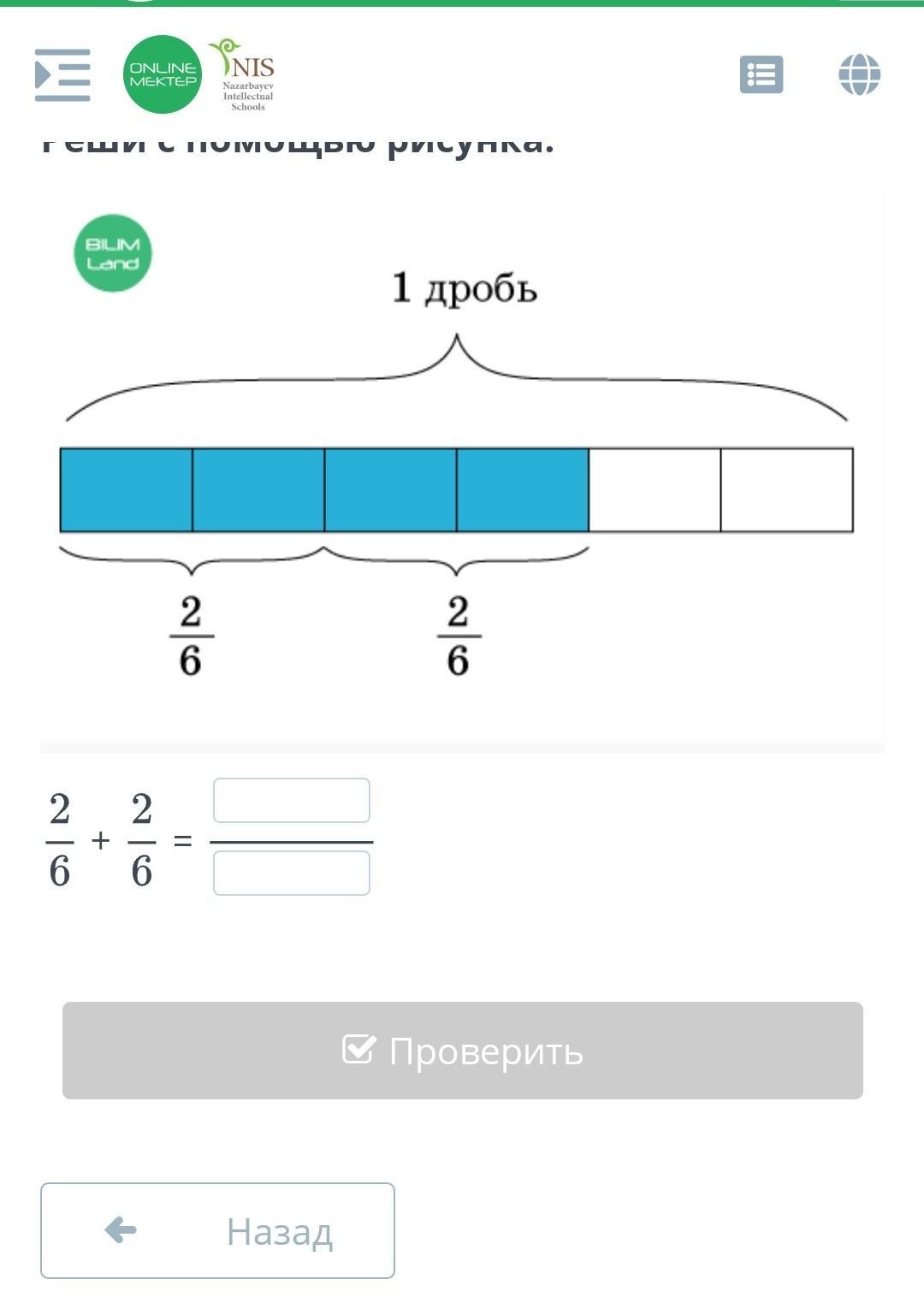 Всё просто. На рисунку изображено 6 частей. Синим зарисованы только 4. Тоесть 4 с 6. Вот и ответ 4/6