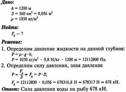 Морская камбала плавает на глубине 50 м. Площадь тела небольшой камбалы примерно 500 см^2. Определите давление и силу давления, которое испытывает рыба.