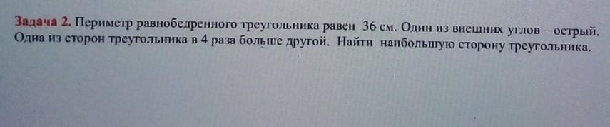 Периметр равнобедренного треугольника равен 36 см. Один из внешних углов — острый.