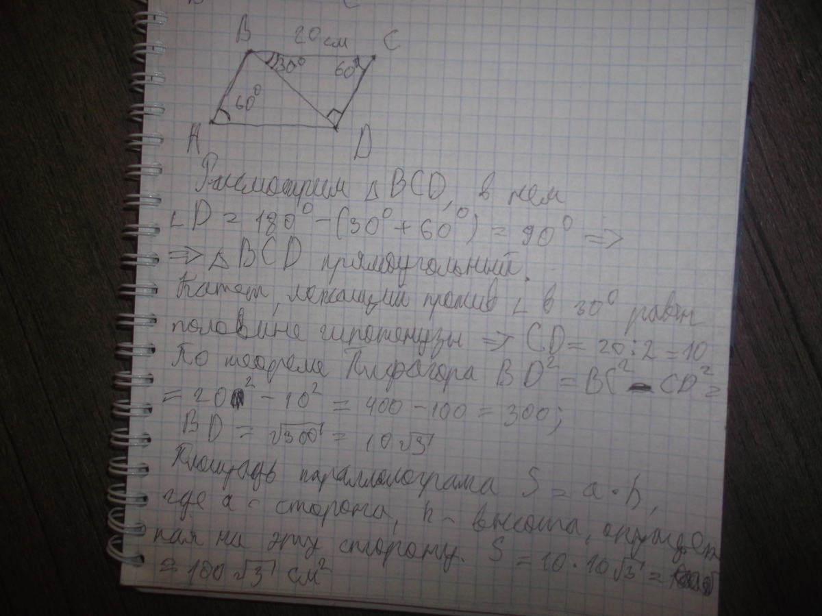 Острый угол параллелограмма равен 60°. Меньшая диагональ наклонена к большей стороне под углом 30°. Найдите площадь параллелограмма, если большая его сторона равна 20.