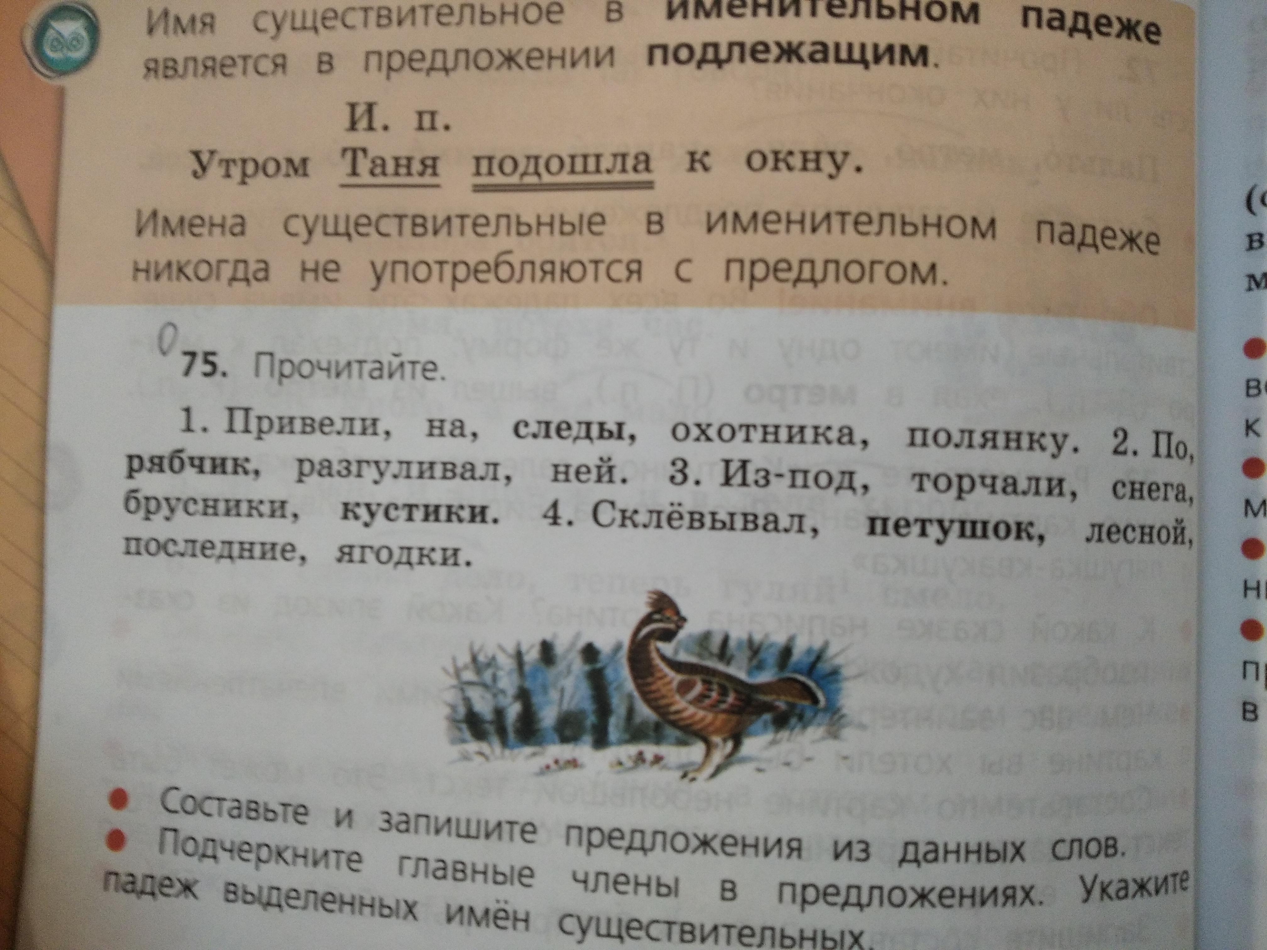 1. Следы охотника привели на полянку. 2. По ней разгуливал рябчик. 3. Из-под снега торчали кустики брусники. 4. Лесной петушок склевывал последние ягодки.