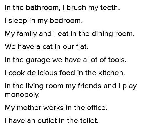составте приговор на англиском на эти слова Bathroom, house, apportionment, door, living room, window, gorden, garage.