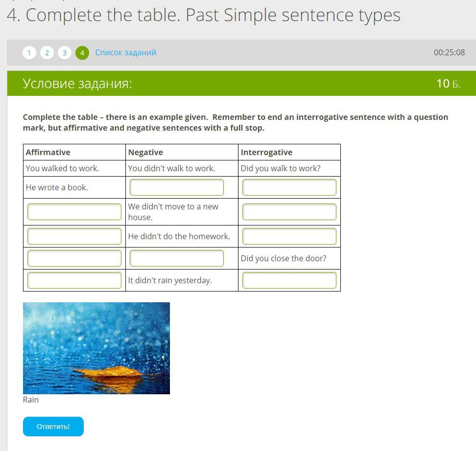 Complete the table. Past Simple sentence type. Пожалуйста пмогите 20 минут осталось СРОЧНО!!!!! 20 баллов даю