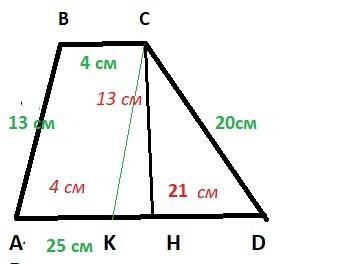 Дано:АВСD- трапеция, АВ=13см, ВС=4см, СD=20см, AD=25 см, СН⊥AD.