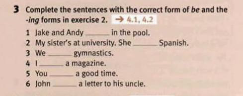 смотри, там сказано, что нужно поставить глаголы в -ing форму, но какие, нужно посмотреть в другом упражнении. Можешь, пожалуйста потом их добавить в вопрос? А пока, я тебе могу помочь только глаголами to be