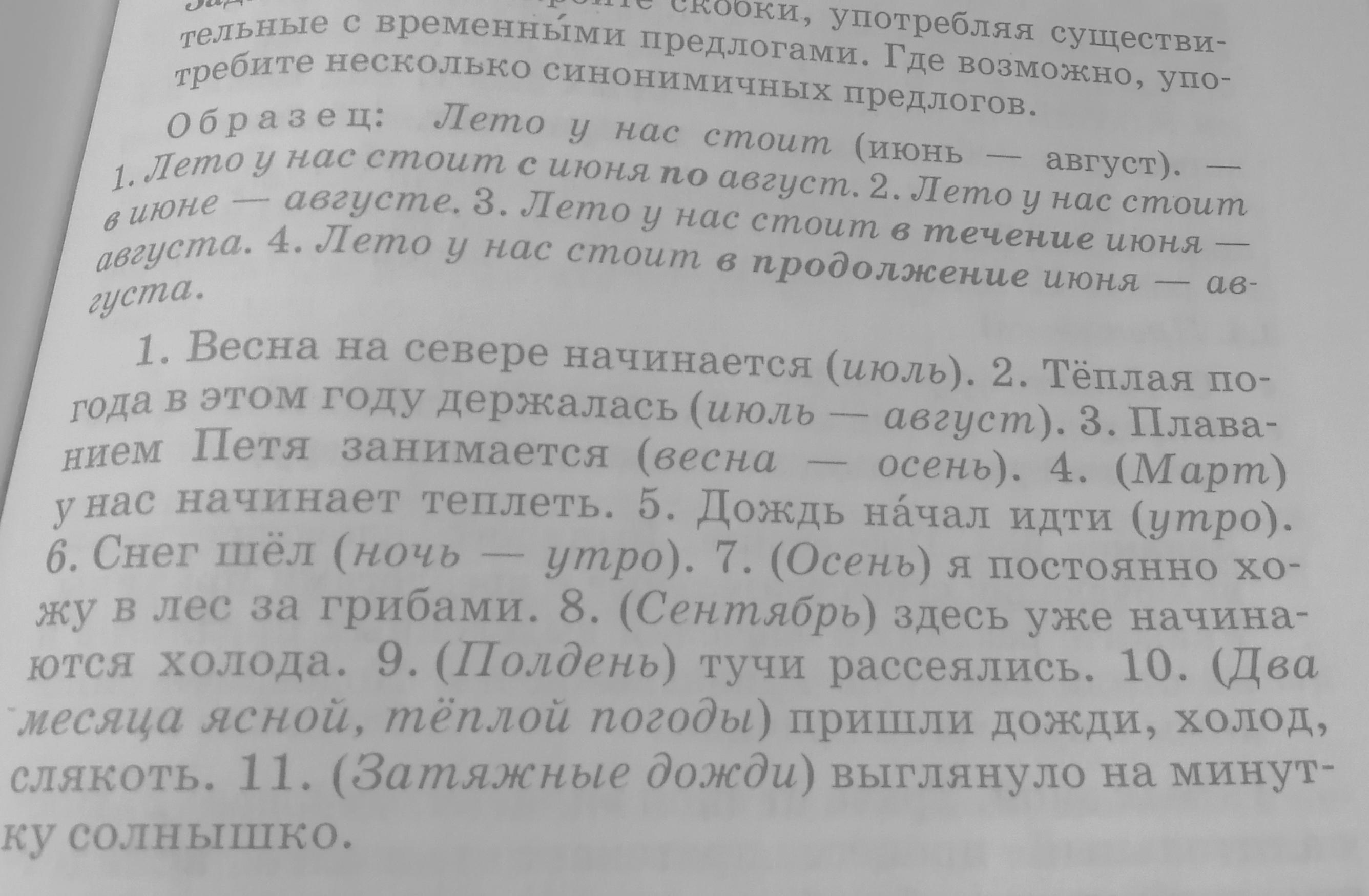 1.Весна на севере начинается в июле. 2.Тёплая погода в этом году держалась с июля по август. 3. Плаванием Петя занимался с весны-осени. 4. В марте у нас начинает теплеть. 5. Дождь начал идти с утра. 6. Снег шёл с ночи по утро. 7. Осенью я постоянно хожу в лес за грибами. 8. С сентября здесь уже начинаются холода. 9. В полдень тучи рассеялись. 10. Из двух месяцев ясной, тёплой погоды пришли дожди, холод, слякоть. 11. Из затяжных дождей выглянуло на минутку солнышко.