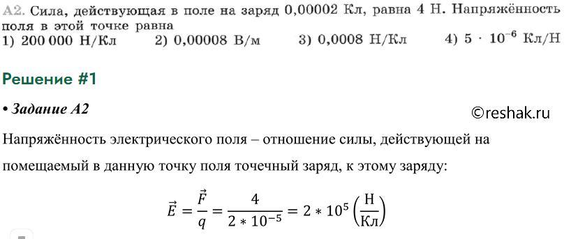 Напряженностью электрического поля в точке называется отношение силы, которая действует на заряд, помещенный в данную точку, к величине этого заряда. В данной задаче на заряд, величина которого равна 0,00002 Кл или Кл действует сила равная 4 Н. Тогда, исходя из определения, получаем, что напряженность это