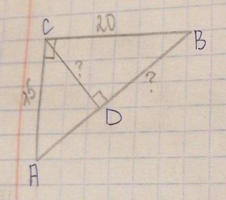 Дано: ΔАВС - прямоугольный, ∠С=90°, АС=15, ВС=20. СД - высота. Найти СД, ДВ.