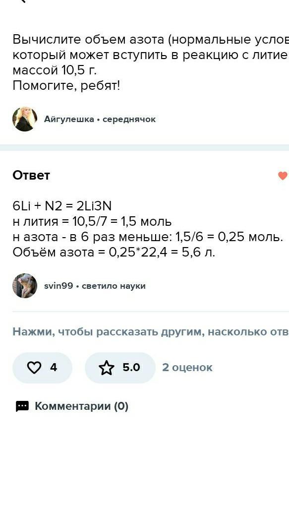 Рассчитайте объём азота, реагирующий с 2,1 г лития. Какой объём воздуха содержит такой же объём азота?