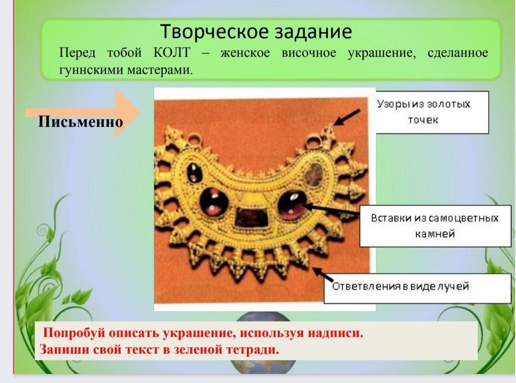 Пепед нашими глазами мы можем увидеть КОЛТ, это сём известное женское в сочное украшение, сделанное гуннскими мастерами. Само украшение имеет бобовиднкб форму и ответсвления в виду лучей, похожих на личу солнца, на которых присутствуют узоры из золотых точек. Цвет данного изделия, это ярко золотой, так же мы можем увидеть несколько больших само цветных камней, которые тоже будут привлекать внимание окружающих.