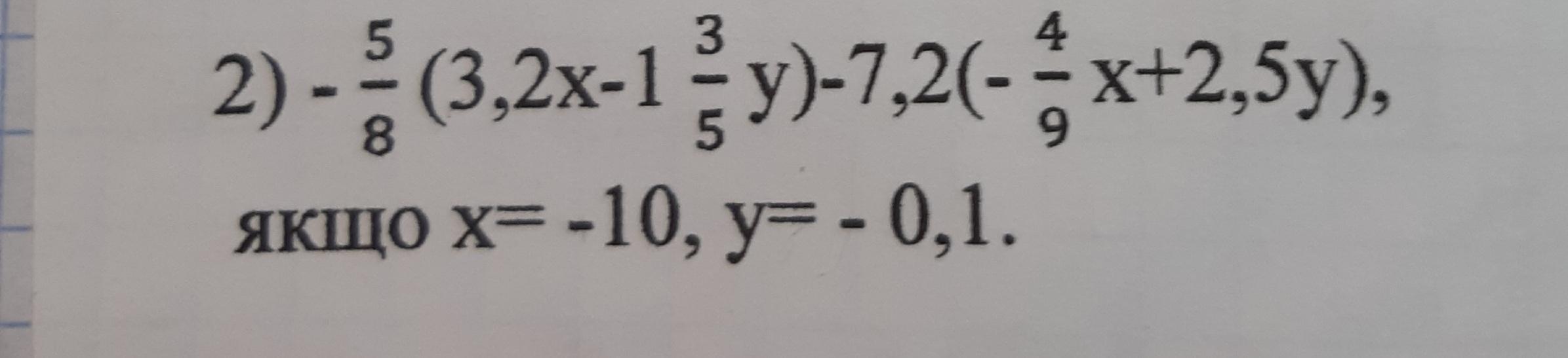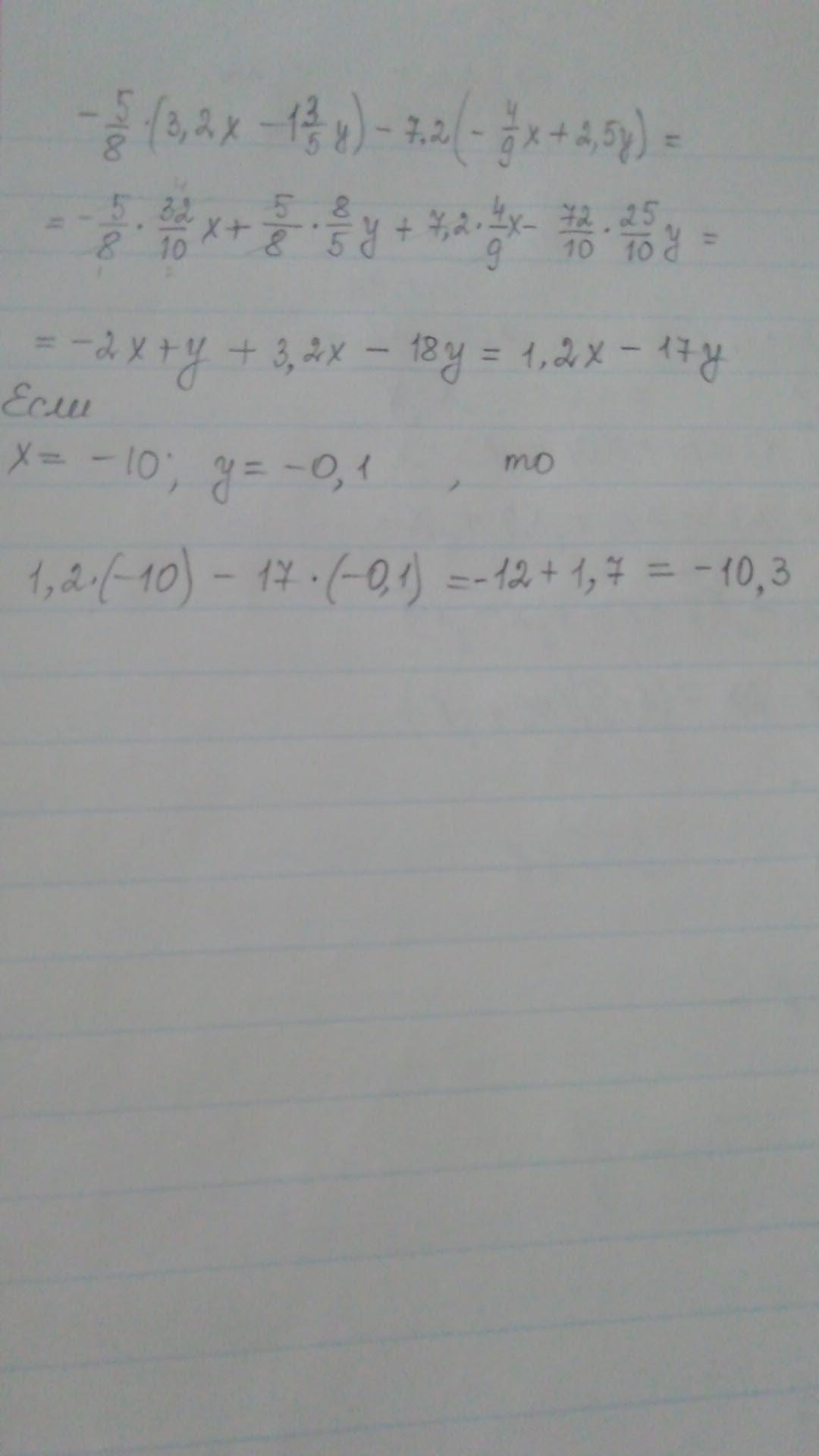 Пошаговое объяснение: = -5/8·3,2x +5/8·8/5 y+7,2·4/9 x-7,2·2,5y=