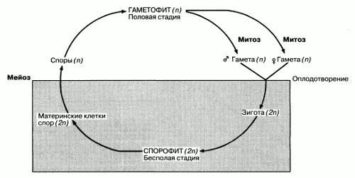 В жизненном цикле высших споровых растений наблюдается закономерная смена двух поколений - бесполого диплоидного (спорофита) и полового гаплоидного (гаметофита). Соответственно, чередуется бесполое размножение (образование спор) и половое размножение (с образованием гамет и оплодотворением).