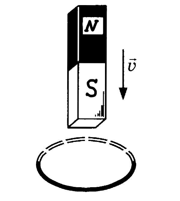 К сплошному металлическому кольцу приближают магнит как показано на рисунке. Магнитный поток, пронизывающий кольцо (А) ______. В кольце возникает индукционный ток. Вектор индукции магнитного поля этого тока направлен (Б) ______. Электрический ток в кольце направлен (В) ______ . В результате кольцо и магнит будут (Г) _______ .