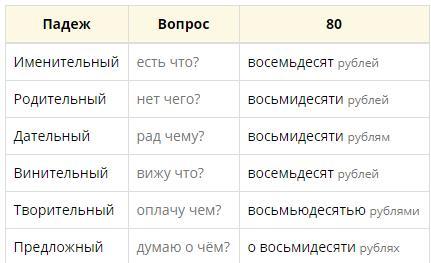 Именительный падеж восемьдесят Родительный падеж восьмидесяти Дательный падеж восьмидесяти Винительный падеж восемьдесят Творительный падеж восемьюдесятью восьмидесятью Предложный падеж восьмидесяти. › [ предыдущие слова / previous words ] восемьдесят [ восемнадцатая восемнадцатое восемнадцатые восемнадцать восемь ] [